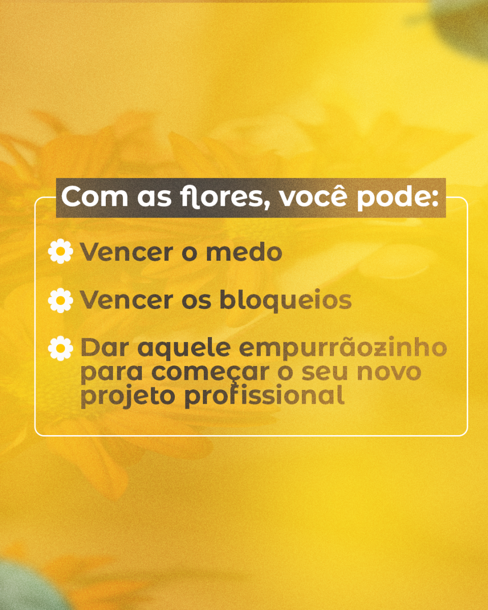 Na terapia floral, trabalhamos com essências que ajudam a dissolver medos, superar bloqueios e despertar a coragem para iniciar aquele projeto profissional que está guardado aí dentro.