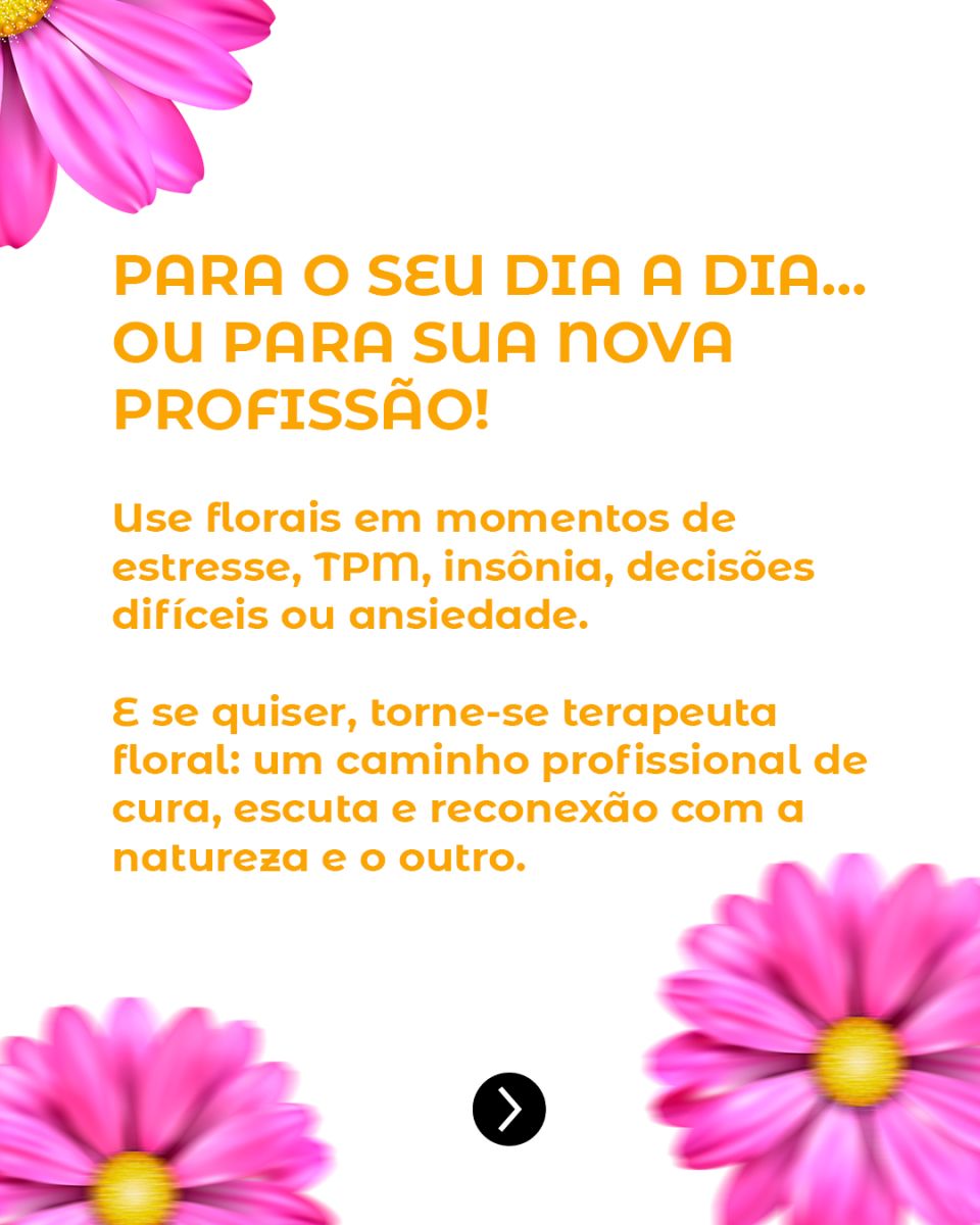 A terapia floral é uma ferramenta incrível para o seu dia a dia – ela te auxilia a enfrentar os desafios, harmonizar as emoções e fortalecer seu autocuidado. E além de transformar sua própria vida, pode tornar sua nova profissão ou complementar o trabalho que você já realiza; um caminho cheio de propósito, onde você oferece acolhimento, equilíbrio e transformação para quem também busca cura e bem-estar.
