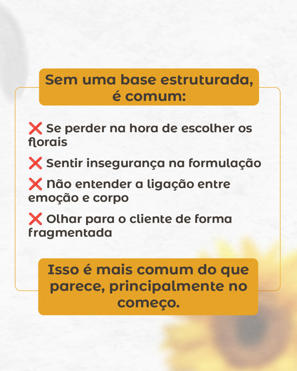 Quando falta uma base estruturada, surgem dúvidas na escolha dos florais, insegurança na formulação e uma visão fragmentada do cliente. Com o direcionamento certo, tudo ganha clareza e profundidade.